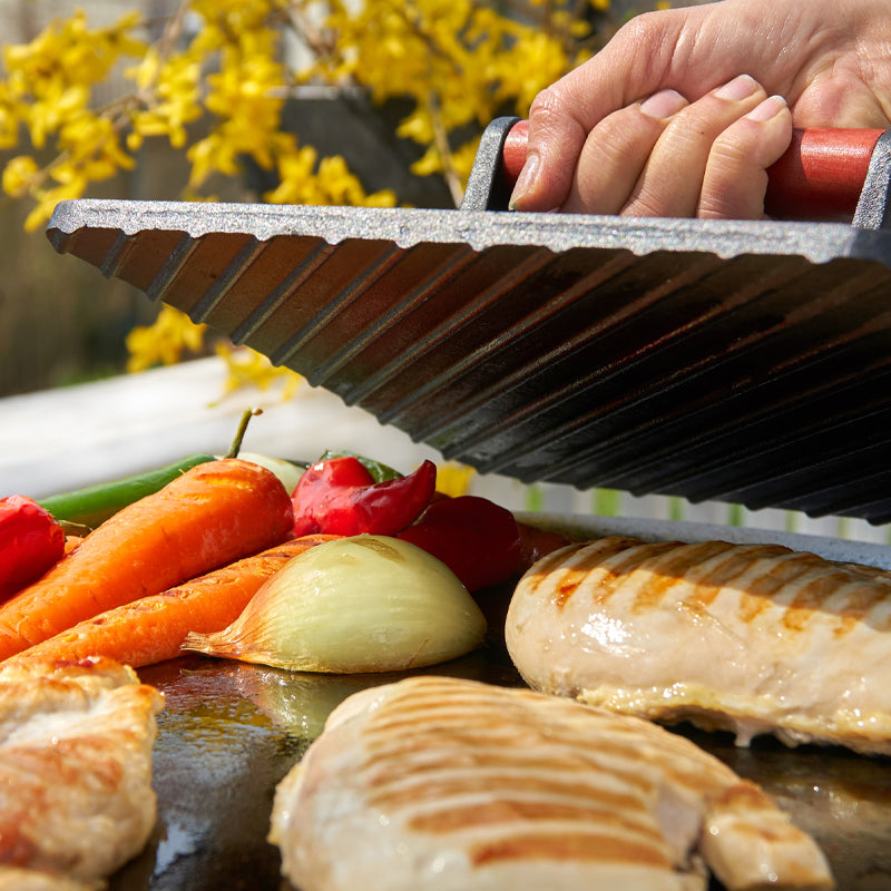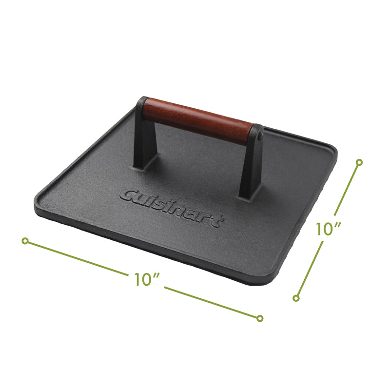 Passez au niveau supérieur en matière de grillades et de grillades avec la presse à griller en fonte XL de Cuisinart. La construction durable en fonte garantit que cette presse résistera pendant des années. La presse de taille commerciale mesure 10" x 10" et aide à favoriser une cuisson uniforme. Elle est parfaite pour presser 6 hamburgers, 4 sandwichs ou 2 à 3 morceaux de steak ou de poulet à la fois. Même sur une plaque chauffante, vous pouvez créer des marques de gril d'aspect professionnel qui épateront vos invités. La poignée en bois offre une prise élégante et confortable qui ne surchauffera pas lorsqu'elle est laissée sur la surface de cuisson. Encouragez une alimentation saine en utilisant la presse pour éliminer la graisse ou les huiles indésirables.