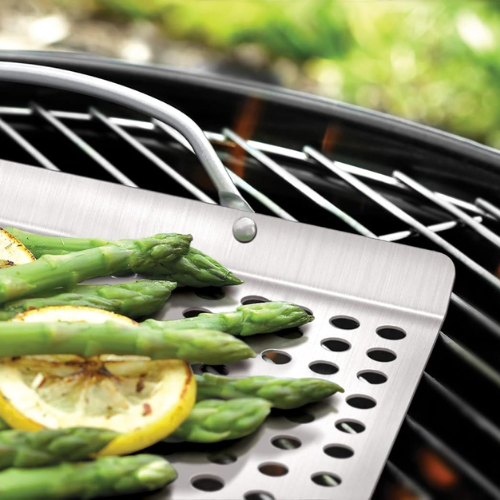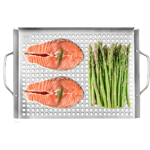 À tous les adeptes de grillades santé ! La grille de grill en acier inoxydable Outset est parfaite pour une cuisson sûre et saine des légumes, viandes et fruits de mer. Ce plateau de grillage facilite la cuisson des morceaux plus petits et délicats de poisson, viandes et légumes. La surface perforée améliore les saveurs naturelles des aliments et empêche les petits morceaux de glisser à travers la grille. Les poignées intégrées pratiques facilitent le transport. Fabriquée en acier inoxydable forgé durable, cette grille de grillage offre une grande facilité d'utilisation. Sa grande taille de 11" x 17" est parfaite pour griller de grandes portions pour toute la famille. Conçue pour résister aux hautes températures, cette grille de grillage peut supporter la chaleur intense !