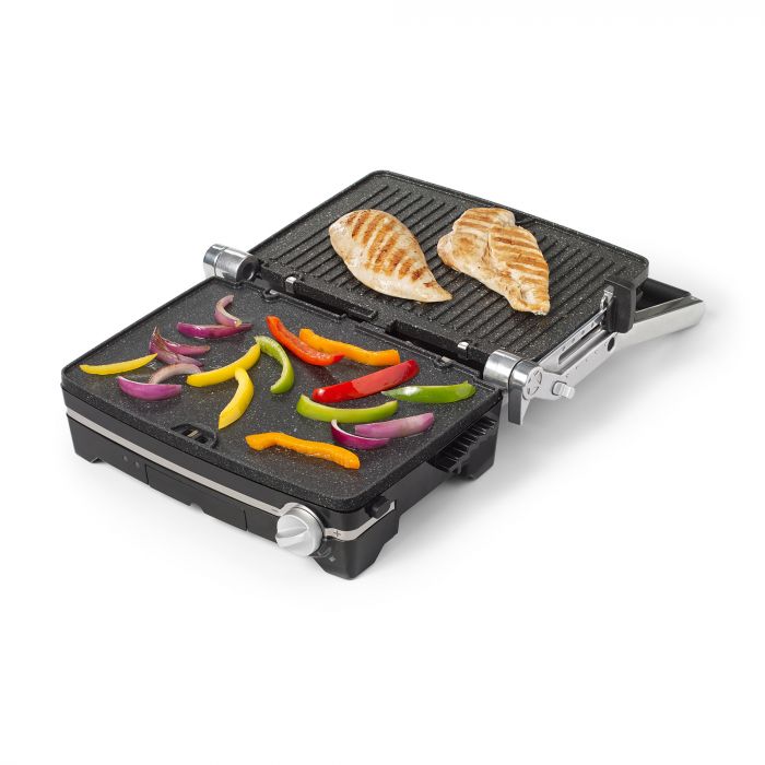 Le Presse-panini Starfrit possède la technologie antiadhésive The Rock. L'appareil comporte deux plaques réversibles - d'un côté plat et de l'autre rainuré. Le Presse-panini peut être utilisé autant pour griller les sandwiches que, une fois ouvert, peut griller des légumes et viandes. Chaque plaque mesure 27,5 x 20 cm. Chaque plaque incorpore le traitement antiadhésif de surface exclusif à The Rock rendant l'appareil agréable à utiliser et facile à nettoyer!