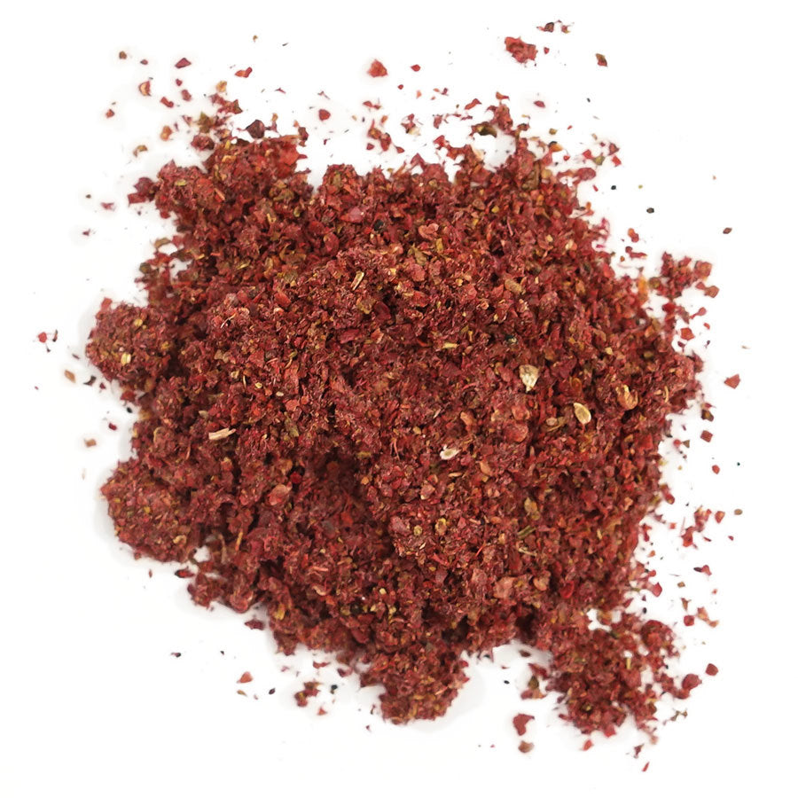 Notre sumac sauvage est récolté en Gaspésie. Les fruits ne sont pas dénoyautés avant d'être broyés, ce qui donne au sumac moulu une texture plus grossière. Contrairement au sumac qu'on trouve généralement sur le marché, celui-ci n'est pas mélangé avec du sel, ce qui fait que son acidité est encore plus marquée.